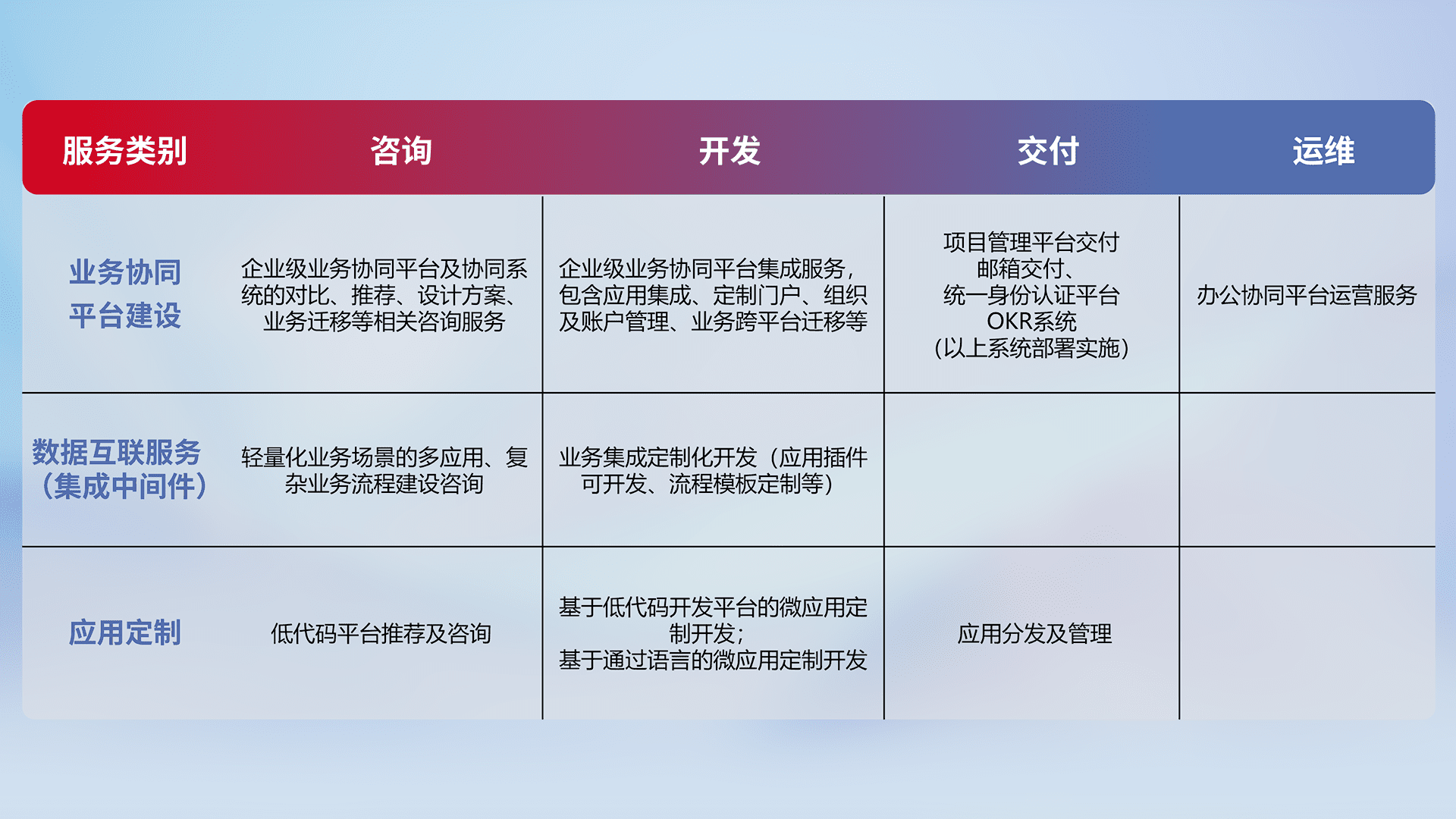 针对钉钉、、企微、、、、IDaas等平台级产品提供产品的规划、、、、方案、、、交付、、、、定制化开发等服务,,,实现如统一协同办公、、智能客户服务、、混合会议管理、、、、智能数据查询、、、等业务场景,,,实现数字化转型。。。